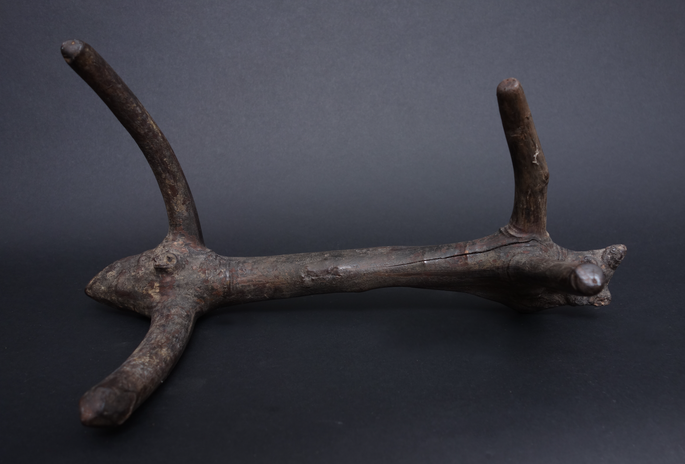 A beautifully old carved zoomorphic headrest, some cracking. Made from one piece of wood. L39cm H17cm. Ex Wayne Heathcote.